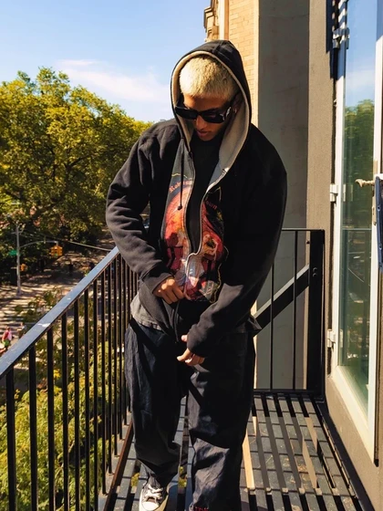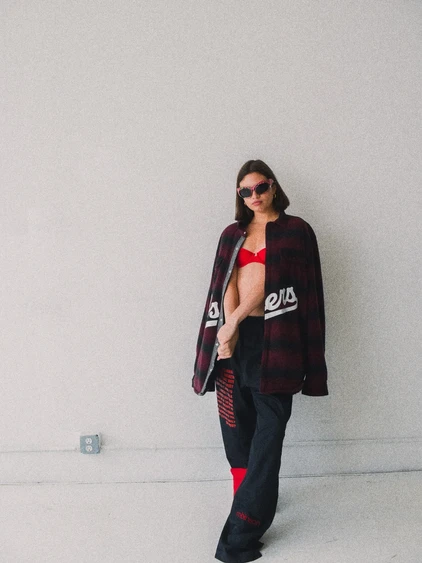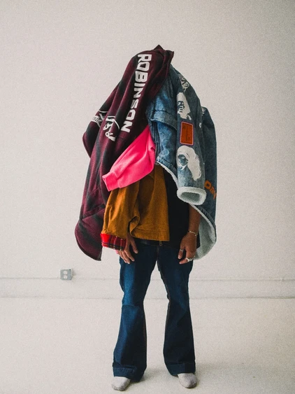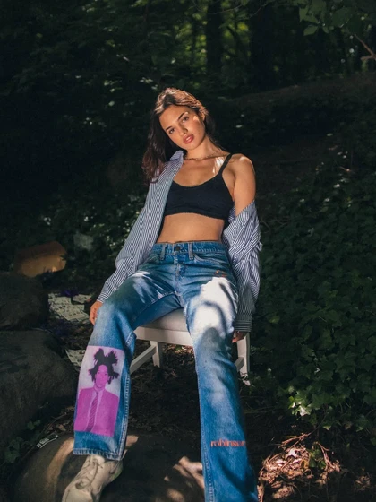Winehouse, Basquiat, Cobain, Hendrix. “27 Club”, Robinson's second collection embodies the fragile connection of superstar dreams to the realities of human sensitivities. The American blue jeans, tough and reliable, transfuse Americans together from across generations through their denim threads; the 27 club, an exclusive group, collects legendary artists under a mythic status through their mortal yet superhuman success. The “27 Club” denim jeans are wearable manifestations of the traces stars leave behind, threads that guide us towards glory as we honor them.